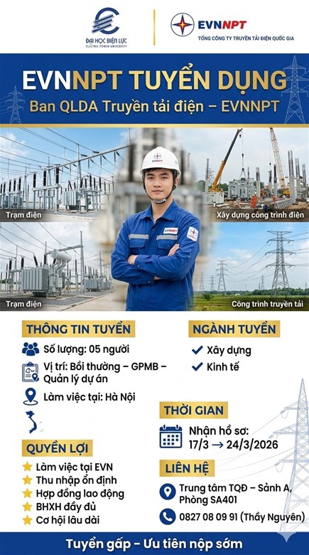 📢 Ban Quản lý dự án Truyền tải điện – Tổng công ty Truyền tải điện Quốc gia (EVNNPT) – Tập đoàn Điện lực Việt Nam thông báo tuyển dụng lao động làm việc tại Hà Nội.