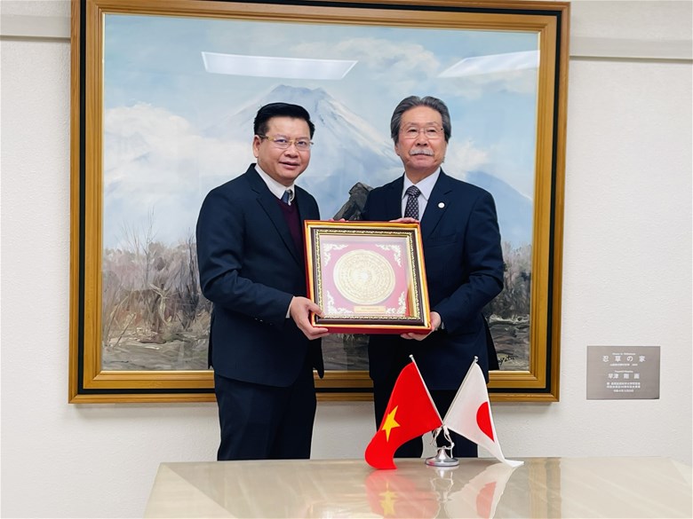 PGS.TS Đinh Văn Châu – Hiệu trưởng Trường Đại học Điện lực tặng quà lưu niệm cho GS. TS. KAMADO Shigeharu - Hiệu trưởng Trường Đại học Công nghệ Nagaoka.