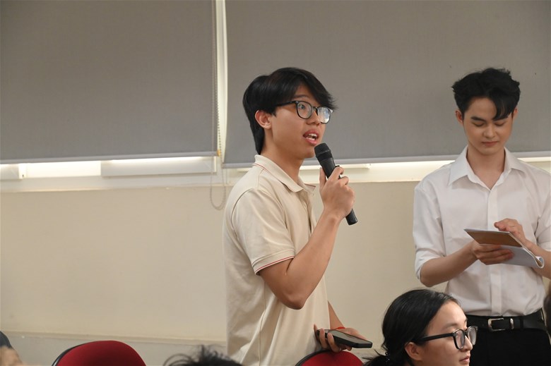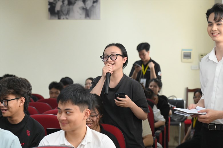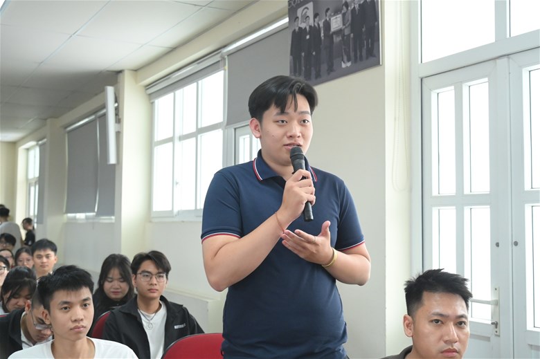 Đặc biệt, phần đối thoại trực tiếp giữa lãnh đạo Nhà trường và sinh viên diễn ra sôi nổi, thu hút nhiều câu hỏi, ý kiến liên quan đến phương pháp giảng dạy, công tác thi cử, điều kiện học tập, cơ hội thực tập và định hướng nghề nghiệp. Các thầy cô đã trực tiếp giải đáp, trao đổi thẳng thắn, giúp sinh viên hiểu rõ hơn các quy định cũng như định hướng phát triển trong thời gian tới.