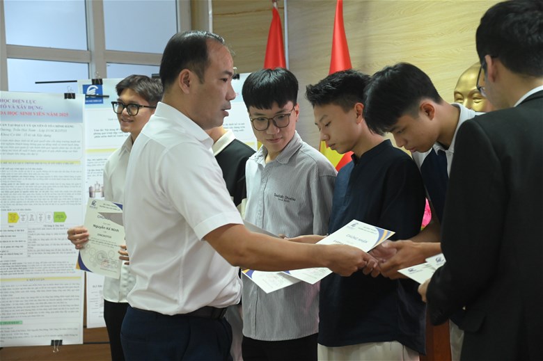 Cuối chương trình, đại diện Khoa Cơ khí – Ô tô và Xây dựng đã trao giấy chứng nhận cho các sinh viên có đề tài tiêu biểu. Đồng thời, TS. Bùi Văn Bình đã phát động Phong trào Nghiên cứu Khoa học Sinh viên năm học 2025 – 2026, khởi động hành trình mới trong hoạt động nghiên cứu và sáng tạo của sinh viên Khoa.