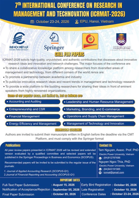 Hội thảo khoa học quốc tế lần thứ 7: Nghiên cứu về Quản lý và Đổi mới công nghệ 2026 (The 7th International Conference on Research in Management and Technovation, 2026 - ICRMAT 2026)