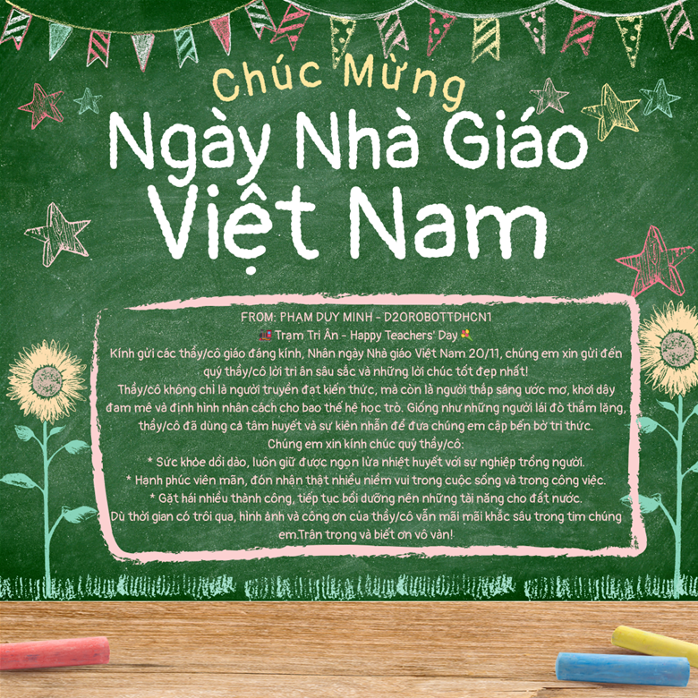 Nhân kỷ niệm Ngày Nhà giáo Việt Nam 20/11, sinh viên Trường Đại học Điện Lực xin kính gửi đến toàn thể quý thầy cô lời chúc sức khỏe, hạnh phúc và thành công.