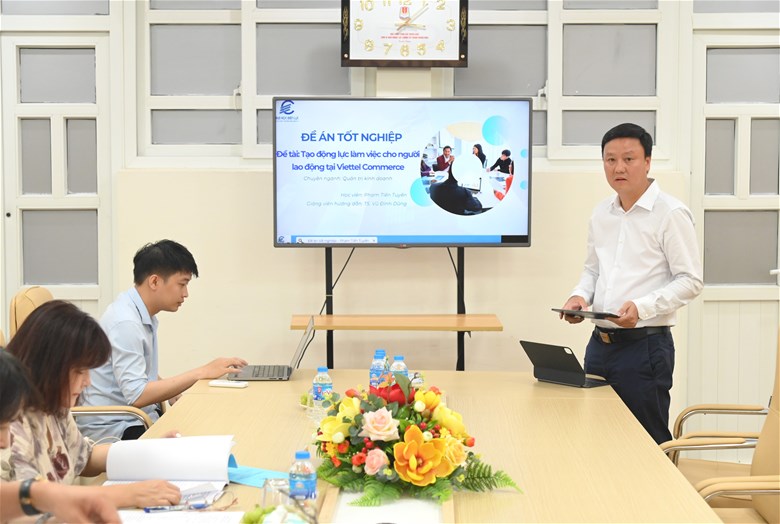 Tại buổi bảo vệ, học viên Phạm Tiến Tuyền đã trình bày nội dung đề án với đề tài: “Tạo động lực làm việc cho người lao động tại Viettel Commerce”. Phần trình bày tập trung làm rõ cơ sở lý luận, phương pháp nghiên cứu, kết quả khảo sát thực tiễn tại doanh nghiệp, đồng thời đề xuất các giải pháp nhằm nâng cao hiệu quả tạo động lực làm việc cho người lao động.