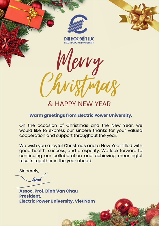Nhân dịp Giáng sinh an lành và chuẩn bị chào đón Năm mới 2026, Hiệu trưởng Trường Đại học Điện lực - PGS.TS. Đinh Văn Châu gửi thiệp chúc mừng tới các cơ quan, tổ chức, đối tác nước ngoài, cùng toàn thể quý vị quan tâm, đồng hành với Nhà trường.