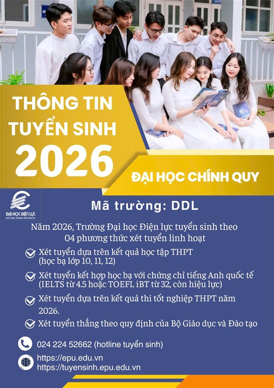 Trường Đại học Điện lực (mã trường DDL) thông báo tuyển sinh đại học hệ chính quy năm 2026 với nhiều điểm đáng chú ý, đặc biệt là việc duy trì đa dạng phương thức xét tuyển, tạo thêm cơ hội cho thí sinh lựa chọn phù hợp năng lực và định hướng nghề nghiệp.