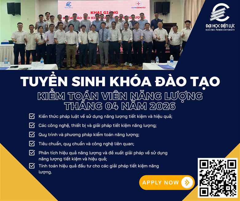 Trường Đại học Điện lực thông báo tổ chức khóa đào tạo KIỂM TOÁN VIÊN NĂNG LƯỢNG tháng 04 năm 2026 cho các đơn vị tư vấn, cơ quan quản lý nhà nước, các cơ sở sử dụng năng lượng trọng điểm trên toàn quốc.